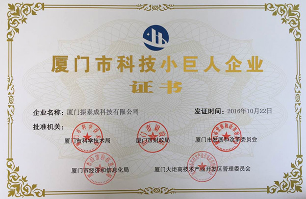 熱烈祝賀我公司廈門振泰成科技有限公司于2016年10月獲得獲得“廈門市科技小巨人”的榮譽證書,謝謝廈門市科學技術局、廈門市財政局、廈門市經(jīng)濟和信息化局、廈門火炬高新技術產(chǎn)業(yè)開發(fā)區(qū)管理委員會和廈門市發(fā)展和改革委員會對我司的高度肯定!